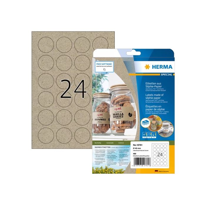 Etiquettes rondes 40 mm HERMA adhésives permanentes à imprimer, en papier silphie (aspect Kraft). Article : 10761