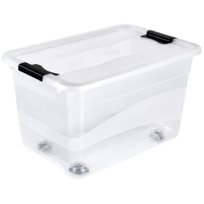 Box de rangement transparent avec couvercle et roulettes 52 Litres KEEEPER Konrad. Article : 1094300100000