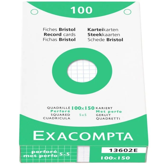 Lot de Fiches Bristol quadrillées et perforées - 100 x 150 mm - Blanches EXACOMPTA pour notes et mémos. Article : 13602E