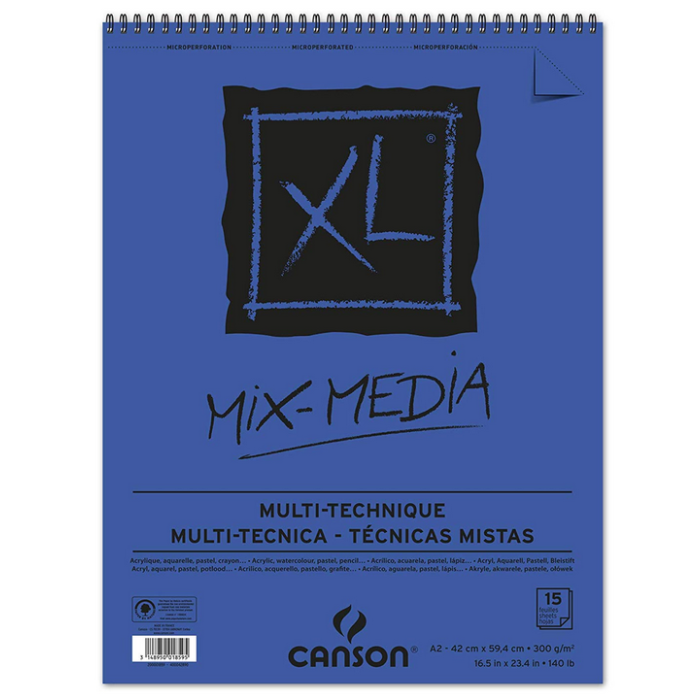 Bloc Canson XL MIX MEDIA de 15 feuilles A2 pour dessin adapté aux techniques pures ou mixtes à base d'aquarelle, gouache, acrylique. Article : C200001859