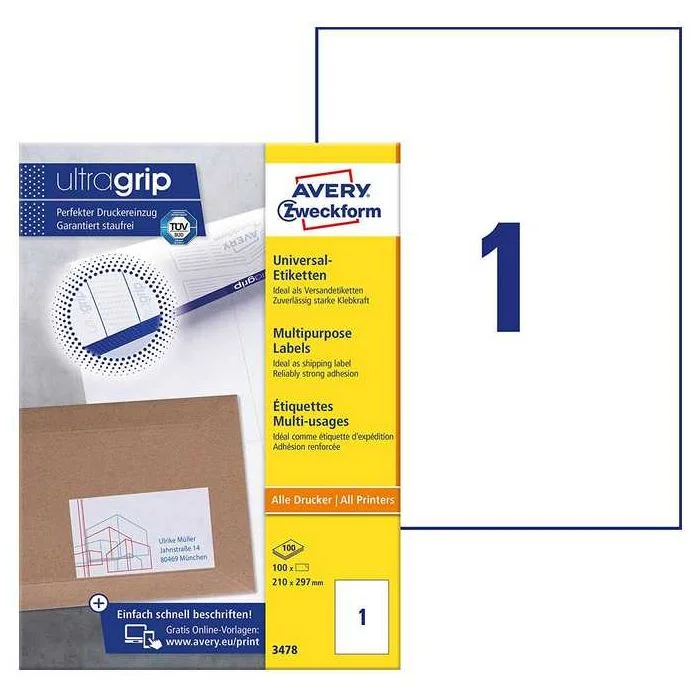 Étiquettes A4 adhésives écologiques pour un marquage de qualité d'Avery. Paquet de 100 étiquettes. Article : 3478