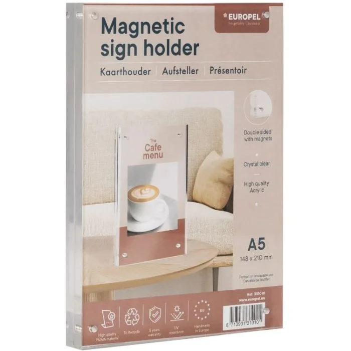 Présentoir de table à aimants en acrylique transparent, format 148 x 210 mm, idéal pour afficher vos prix, promotions, menus et autres informations de EUROPEL. Article : 351010