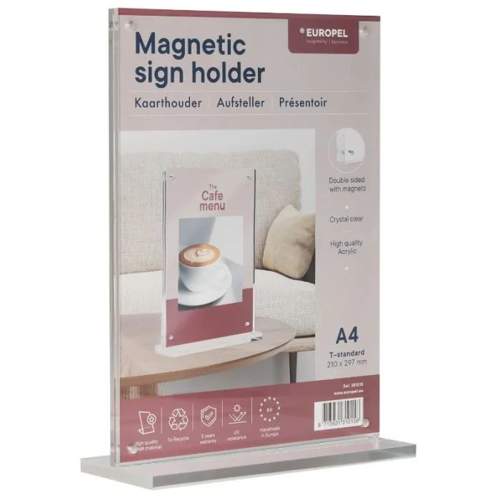 Présentoir de table à aimants avec socle en acrylique transparent, format 210 x 297 mm, idéal pour afficher vos prix, promotions, menus et autres informations de EUROPEL. Article : 351015
