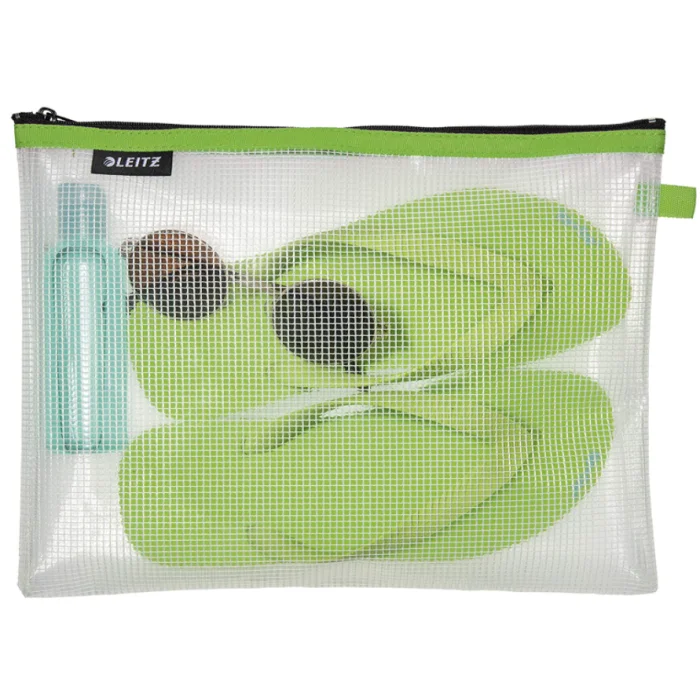 Grande trousse transparente et verte en taille L pour objets divers, idéale pour les voyages LEITZ WOW Traveller. Article : 4026-00-54