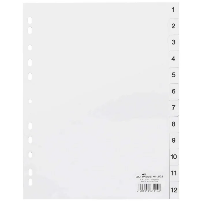 Jeu de 12 Intercalaires numériques blancs extra-larges format 230 x 297 mm de DURABLE. Article : 6112-02