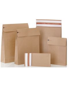 Pochettes auto-adhésives kraft à soufflet avec bande de protection.