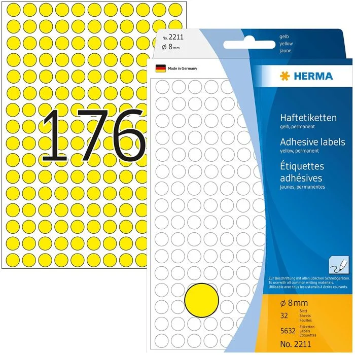Petites pastilles autocollantes rondes jaunes de 8 mm d'HERMA. Article : 2211