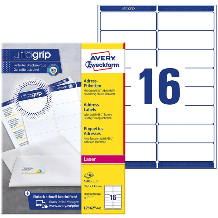 AVERY Étiquettes autocollantes d'adresses 99,1 x 33,9 mm AVERY pour publipostage et marquage de produits. Article : L7162-100FR