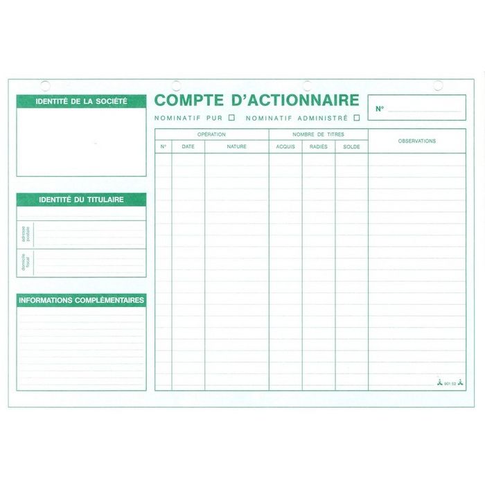 Fiches de comptes d'actionnaires perforées avec 4 trous pour faciliter le classement.